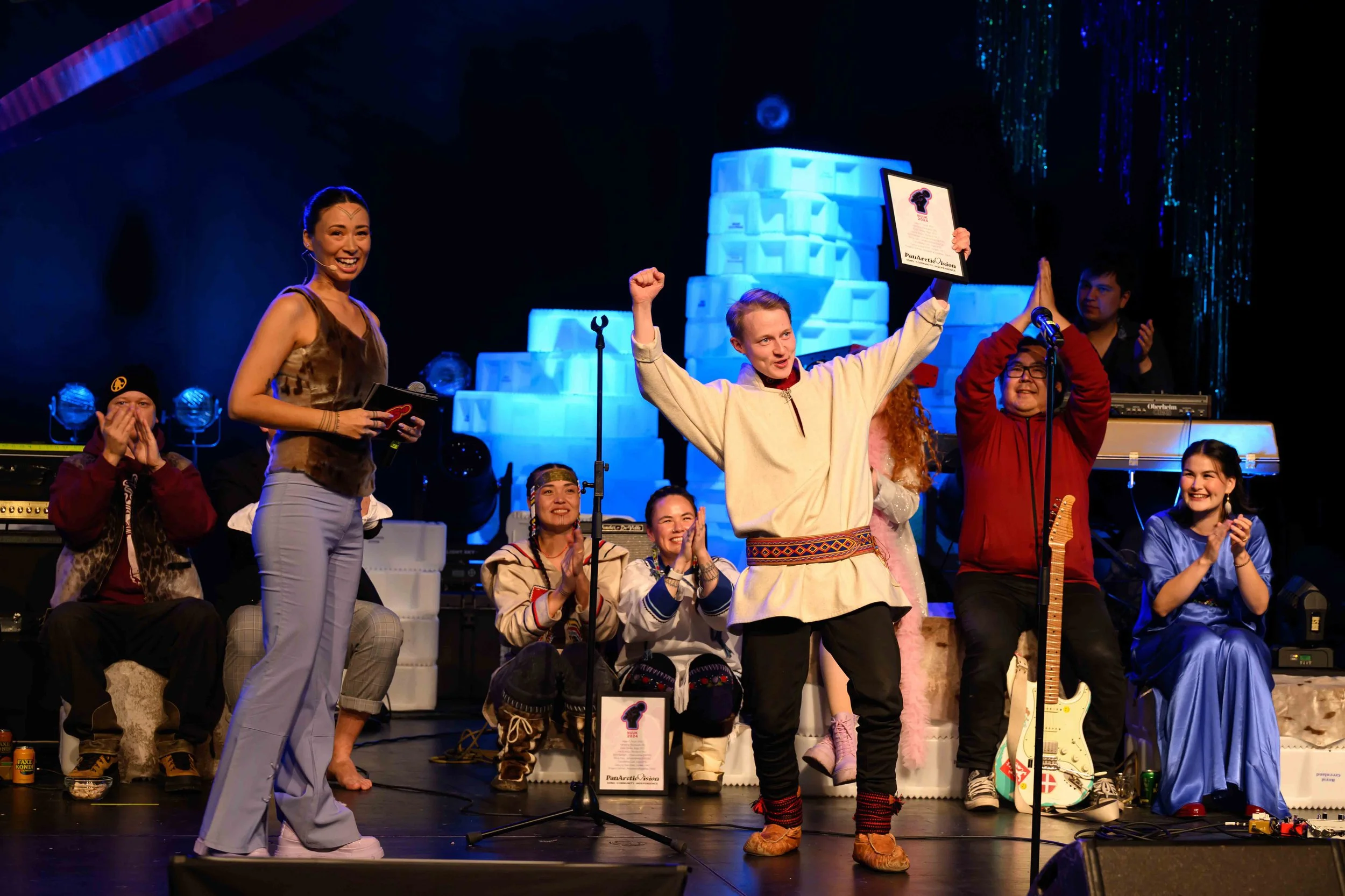 Host Nina Sikkersoq Kristoffersen on stage in Nuuk with Evgeny Goman (RAX), Emil Kárlsen (Sápmi/Nord-Norge) and Iva & Angu (Nunavut).