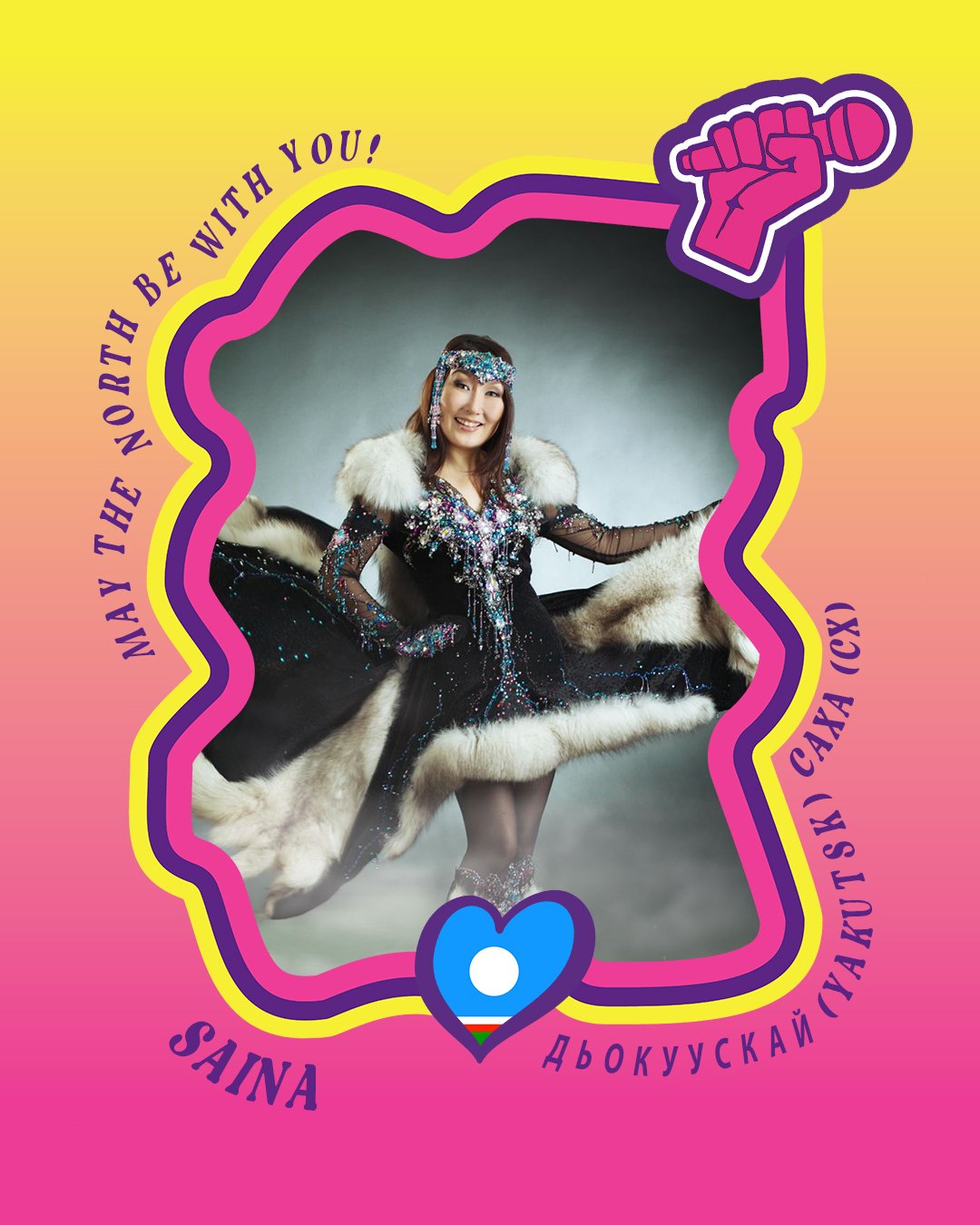 Saina has learned old Evenk, Sakha (Yakut), Chukchi, Even and Yukaghir songs from elders, singing now in over 35 languages, many endangered, and also playing traditional Yakut instruments such as the khomus. These songs were dedicated to important events, rituals and everyday chores and have been passed down by Siberian people for centuries from generation to generation, from mothers to daughters. Saina bridges folk, pop, and classical traditions, and her art and music continue to promote and preserve the heritage of the indigenous peoples of the North.